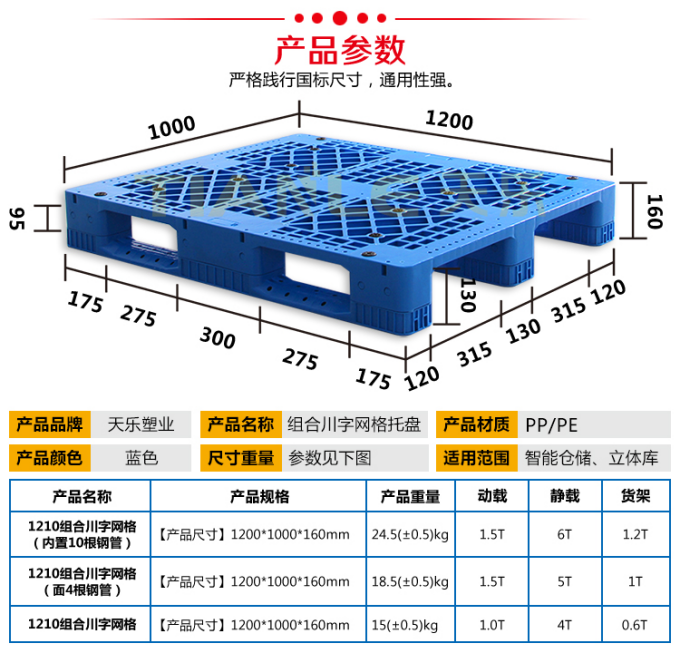 1210組合川字網(wǎng)格塑料托盤-面加4根鋼管